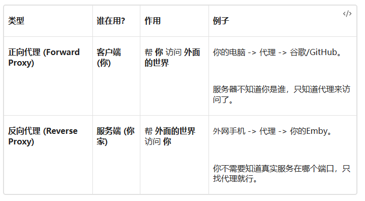 如果没有反向代理: 访客(你自己或家人)想去财务部看电影,必须记得清清楚楚:“我要去 192.168.1.5 的 8096 房间”。如果你记成了 8097,就吃闭门羹。如果有 10 个服务,你要背 10 个端口号,极其痛苦。