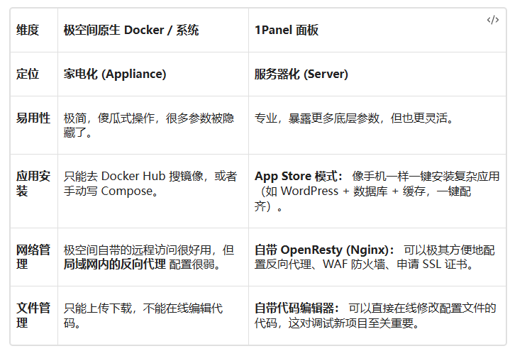 - 如果你要\*\*“搞”\*\*软件(测试 GitHub 项目、修改网页代码、搭建复杂的微服务),极空间原生的功能会让你觉得“手脚被捆住了”,而 1Panel 是解绑工具。