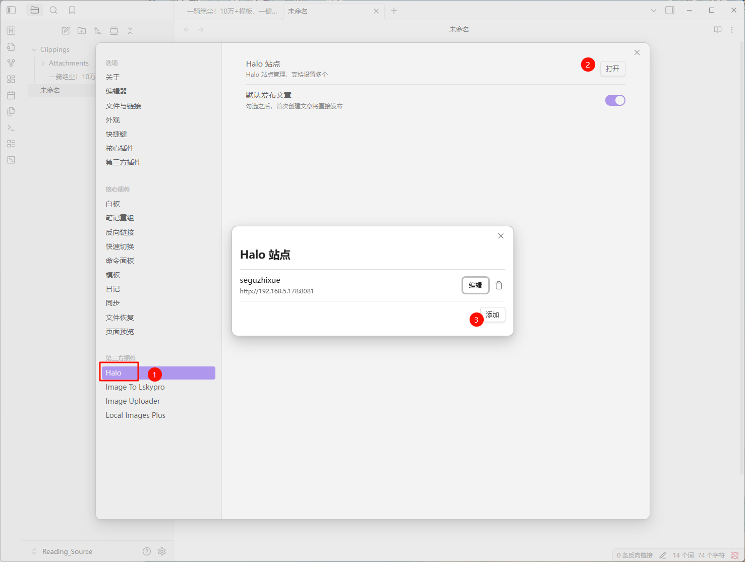 - 插件 :Obsidian 官方 Halo 插件。