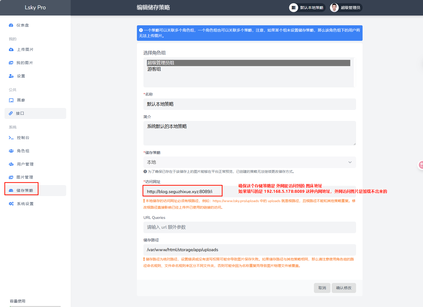 - 在浏览器打开你的兰空图床网页(内网 http://192.168.5.178:8089 或外网 http://blog.seguzhixue.xyz:8089 都可以,只要能访问)。