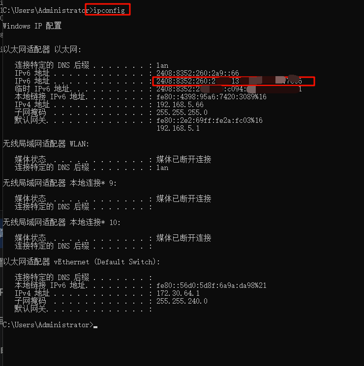- 你的 ipconfig 显示你已经有了 2408:8352... 开头的公网 IPv6 地址。