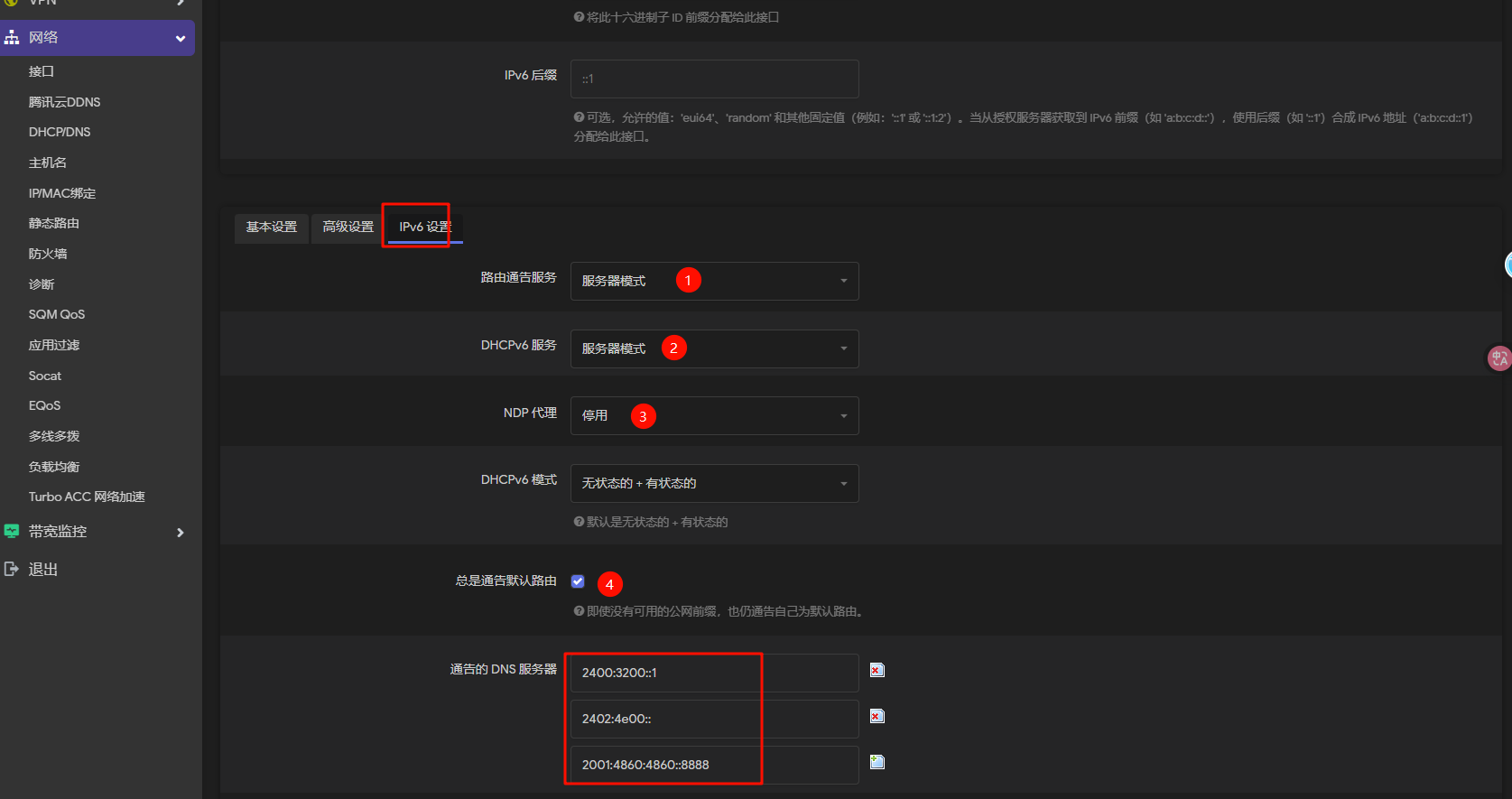 确保LAN口的服务器IPV6设置 这四项和DNS服务器为如图所示