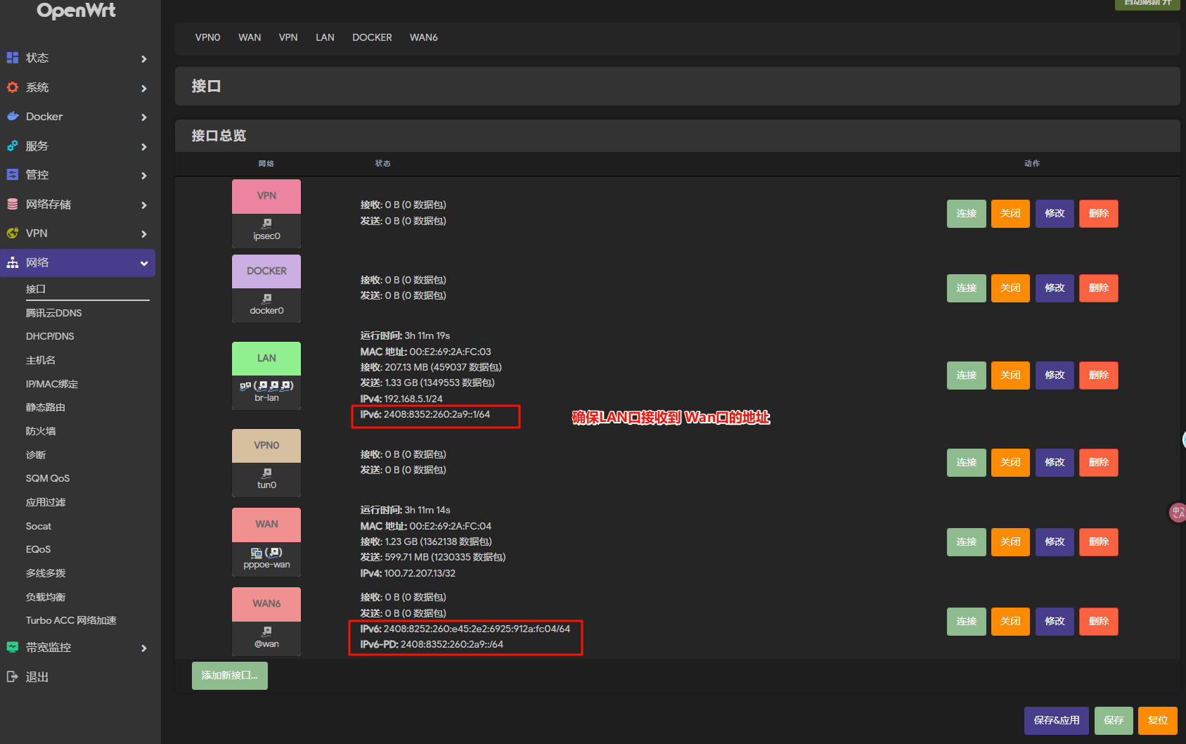 - 解读: 你的局域网接口已经自动使用了上面 WAN6 获取到的 PD 前缀,并生成了局域网网关地址。这是连接设备的网关。