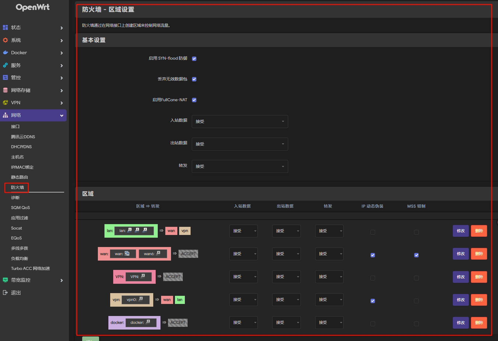 4. 防火墙放行 :OpenWrt 防火墙允许入站。