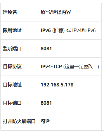 - 解释:你截图上选的是 IPv6-TCP *,这是* ***错*** 的。因为你要转发给内网的 192.168.5.178 *,这是一个* ***IPv4*** 地址,所以目标协议必须是 IPv4。