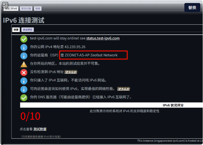 - 关键点: 请看网页截图中显示的运营商 (ISP)。它显示的是 "ZEONET-AS-AP Zeofast Network" ,而不是你的宽带运营商(比如中国联通 China Unicom)。