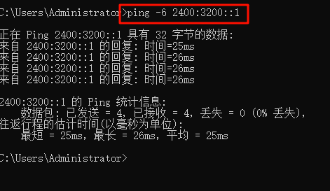 输入命令:ping -6 2400:3200::1 (这是阿里 DNS 的 IPv6 地址)