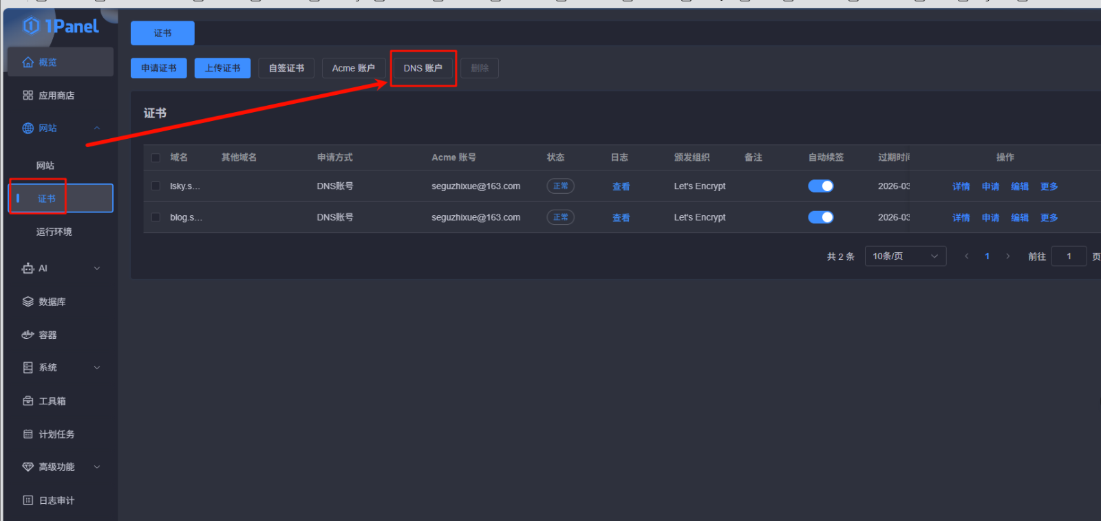 2. 在 1Panel 添加 DNS 账户 :