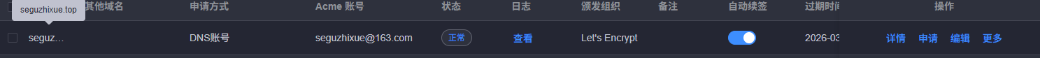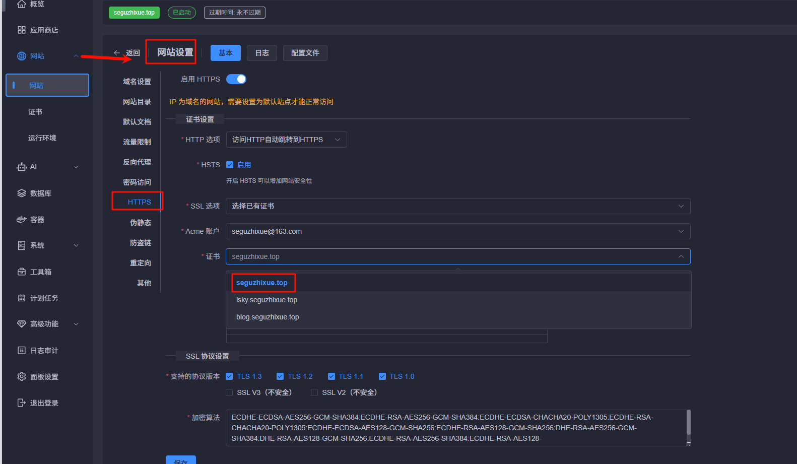 - 在下方的证书选择框中,选择你刚才在第二步申请到的 seguzhixue.top 证书(或者一证书多域名)。