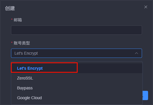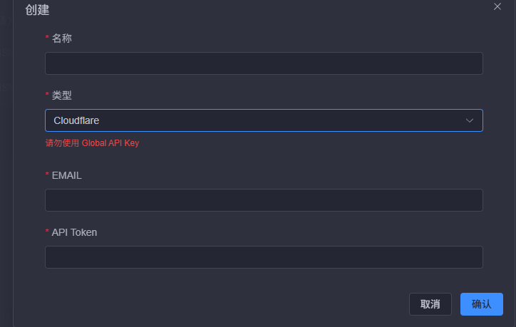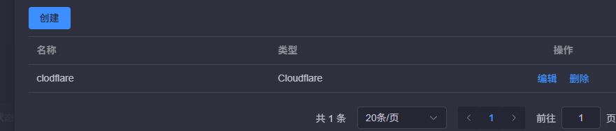 - 回到 1Panel,点击左侧菜单 证书 -> DNS 账户 -> 创建 。