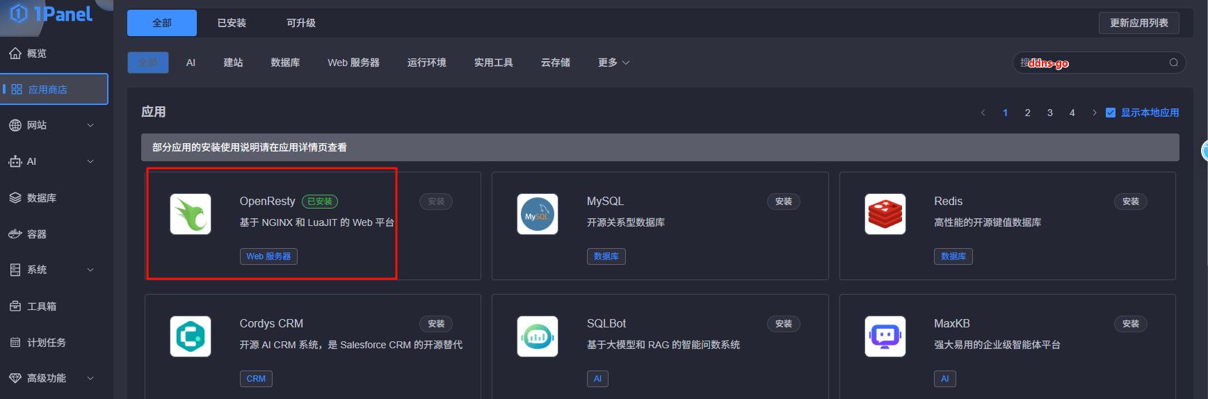 2. 在1Panel面板上安装OpenResty和DDNS-go