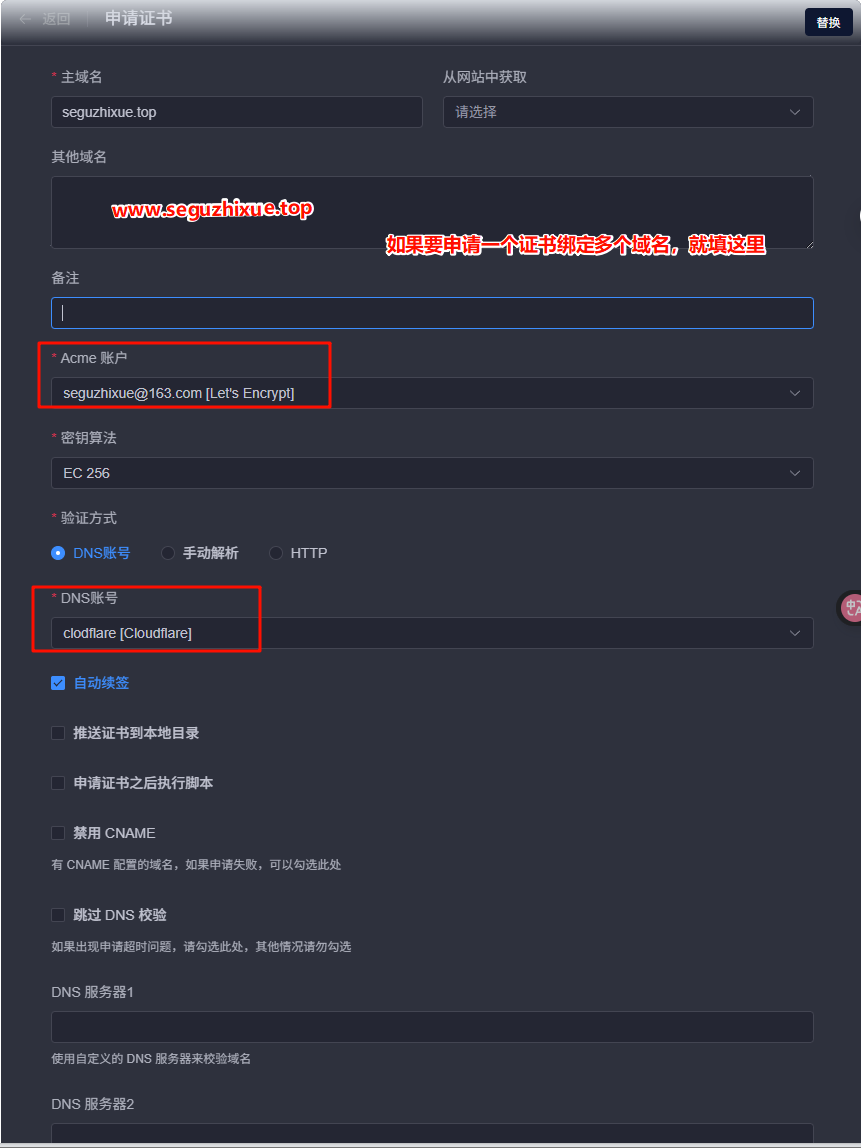 注意:如果你想www.seguzhixue.top和 seguzhixue.top,同时指向同一个服务,这里的证书申请的地方就要填两个域名,相当于一个证书验证两个域名(一个一级域名,一个二级域名)。