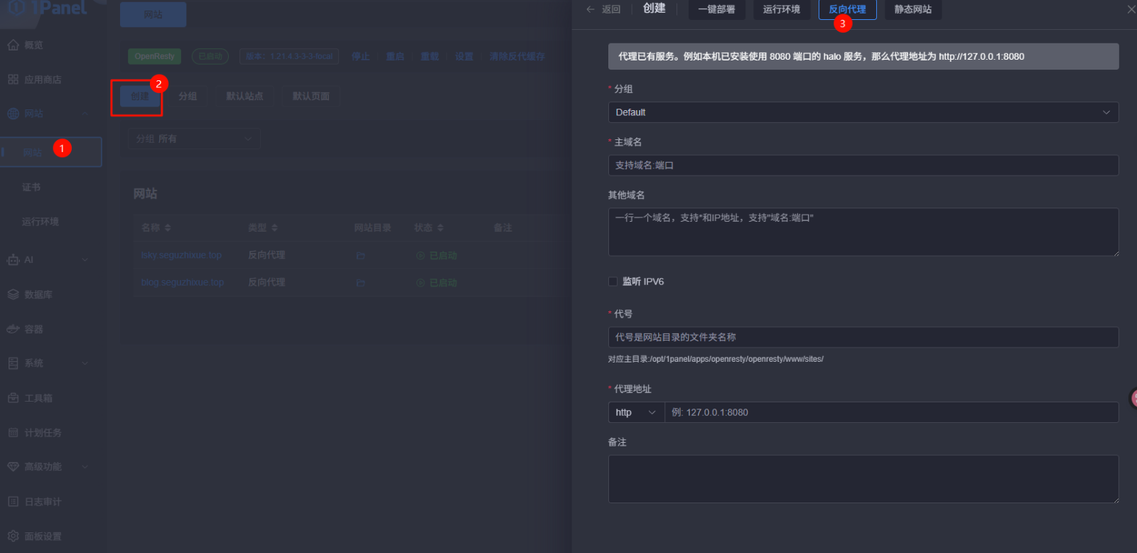 第三步:创建反向代理网站(核心步骤)