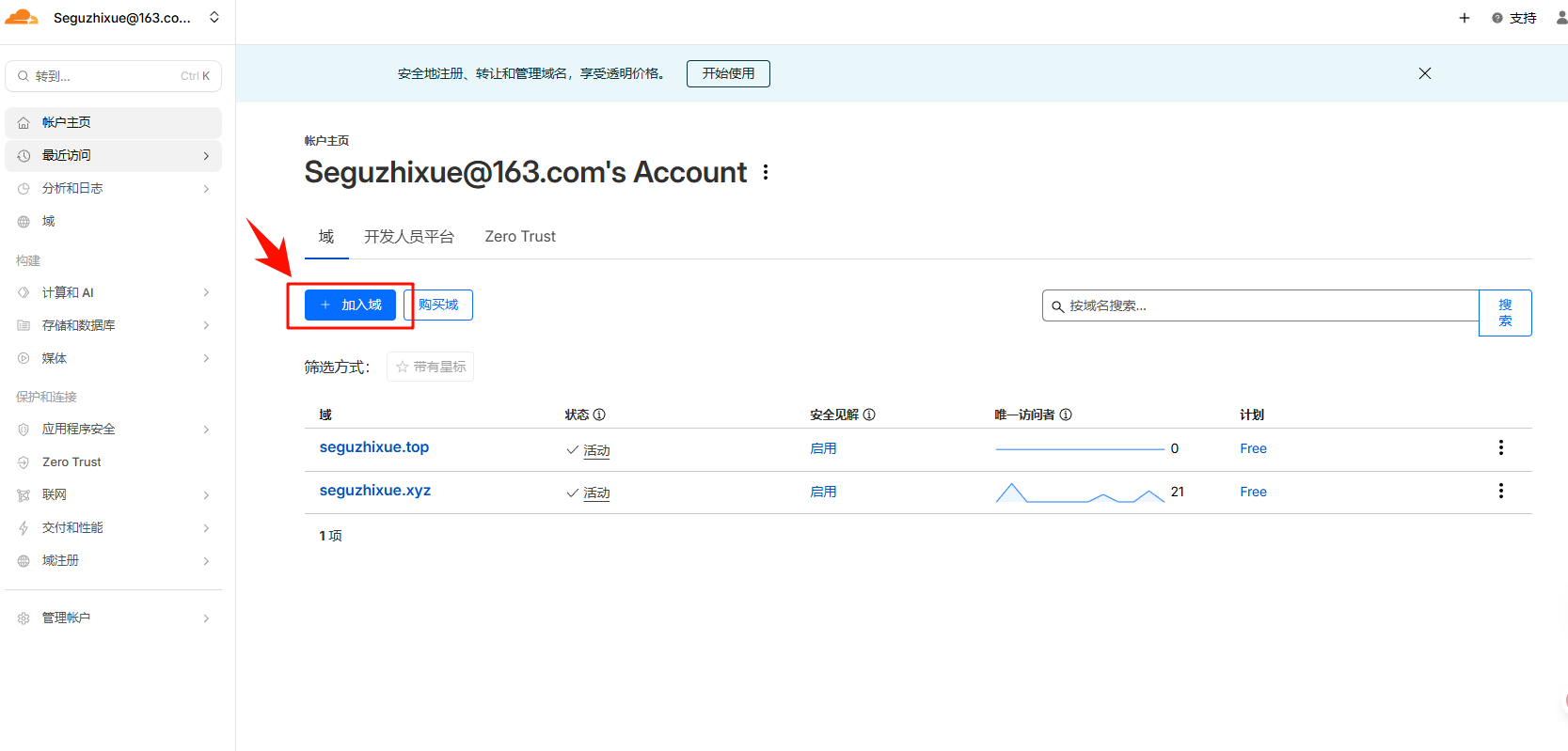 2. 在 Cloudflare 中点击 Add a site ,输入 Seguzhixue.top