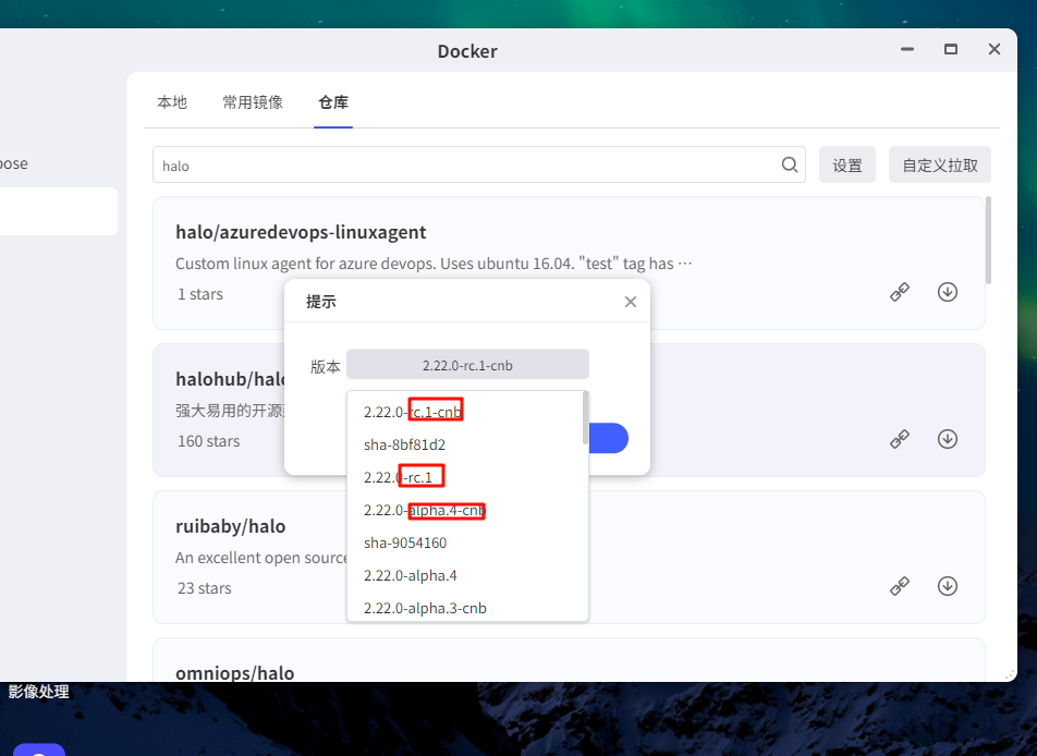 2. 搜索 halohub/halo ,下载 latest 或 2.13 以上版本, 这里尤为注意不要选后面有后缀的 )。