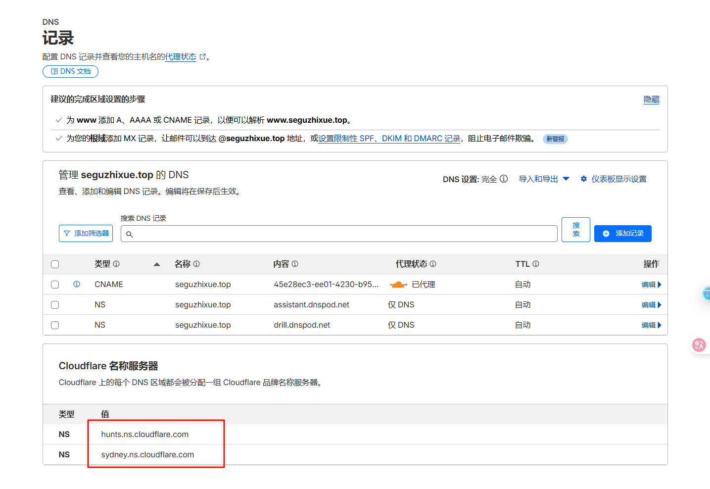 为了使用 Cloudflare Tunnel,你需要将你的域名 seguzhixue.top 的 DNS 解析托管给 Cloudflare(免费)。
