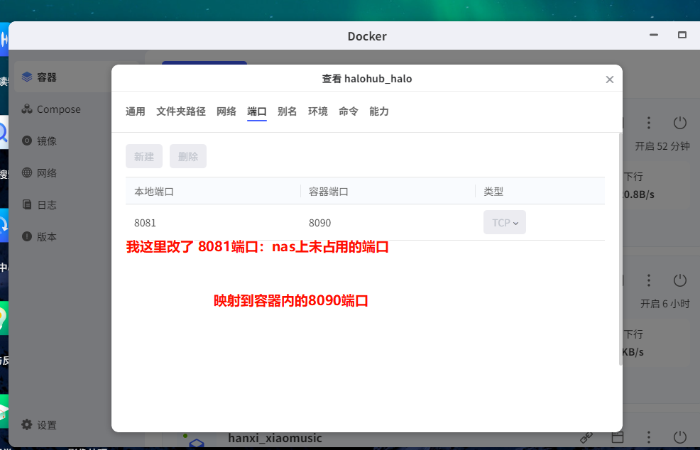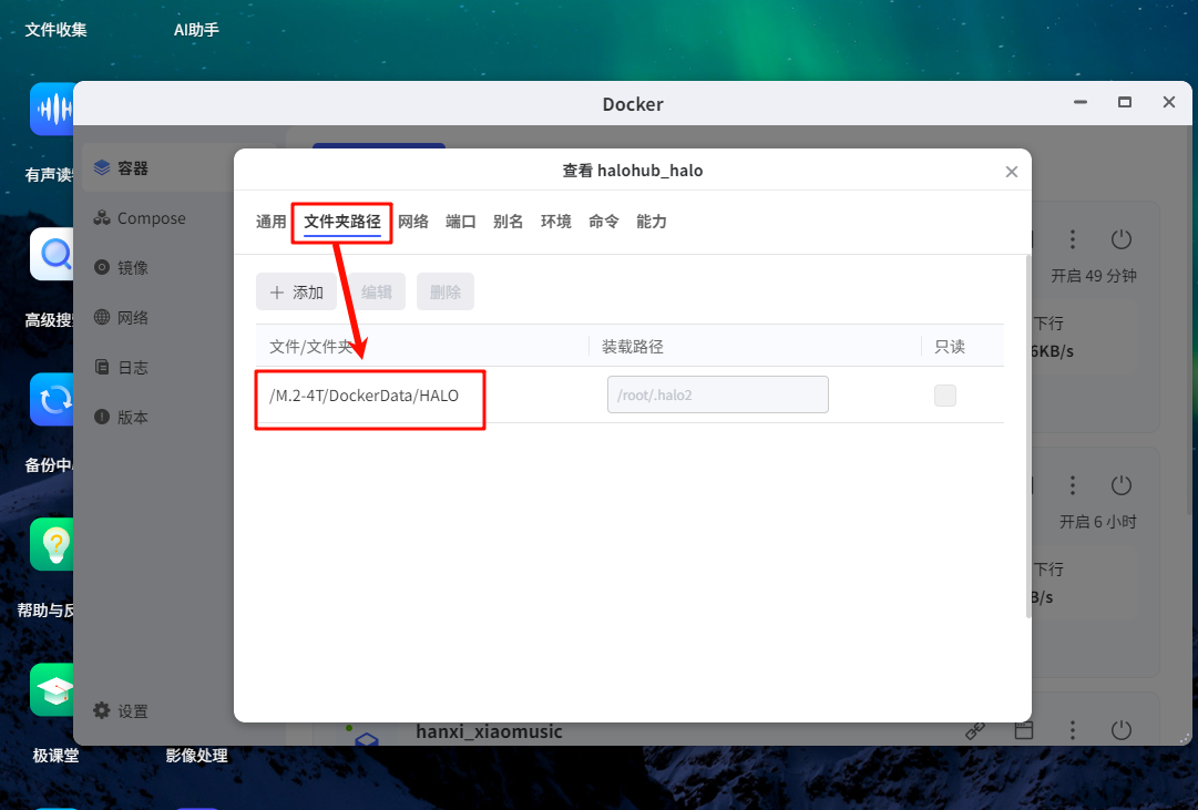 - 映射路径: /Docker/halo 映射到容器内的 /root/.halo2 (注意:Halo 2.0 路径变了,是.halo2)。
