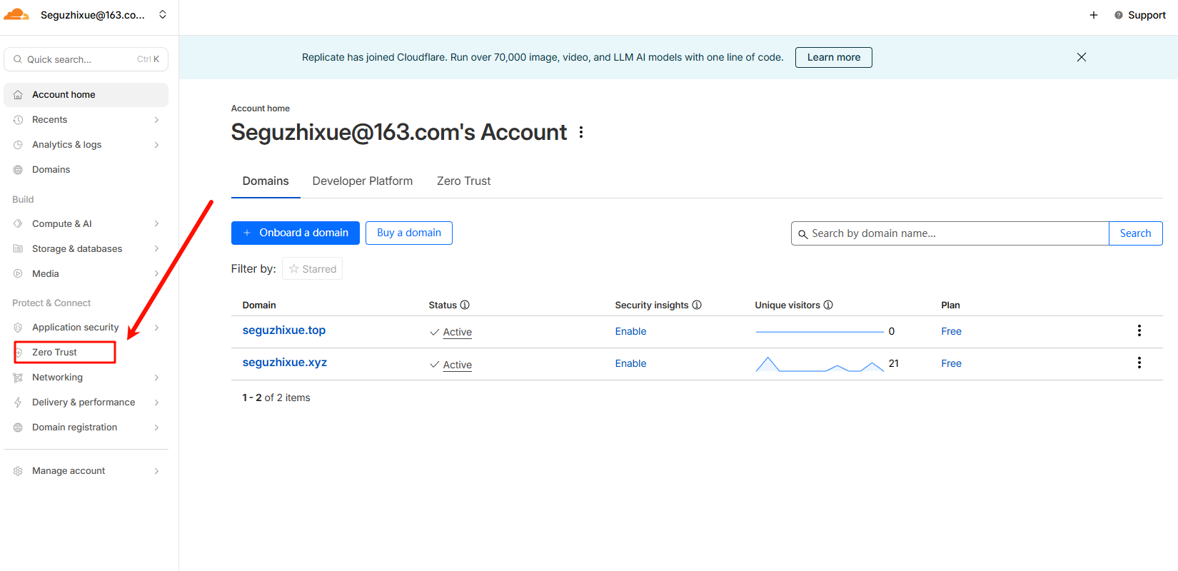 2. 进入 Cloudflare 后台,左侧菜单点击 Zero Trst (能需要点一下开通,免费的)