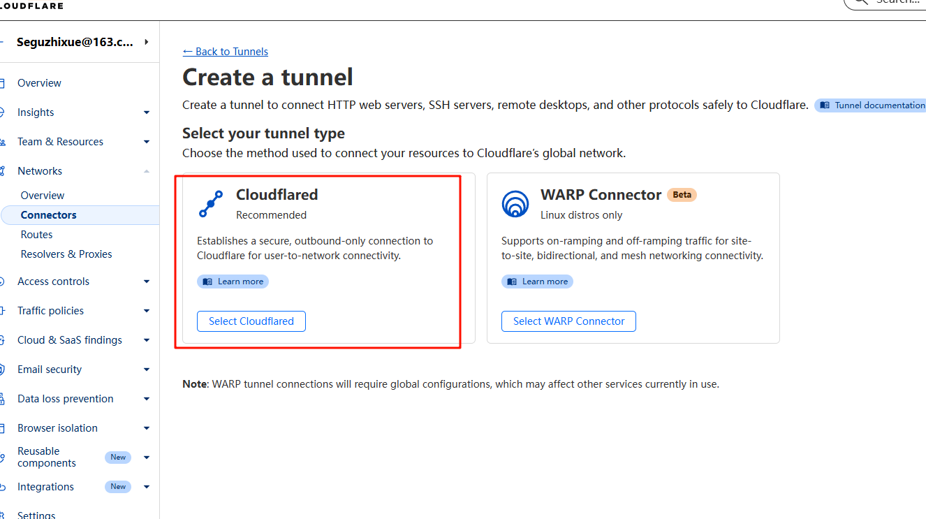 - 在 Zero Trust 面板中,点击 Networks -> Tunnels