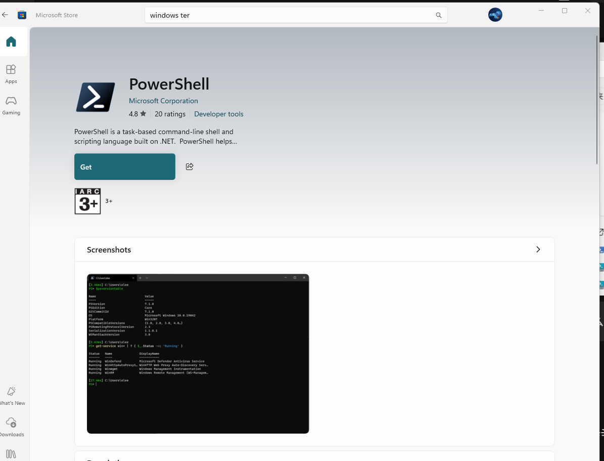 建议操作:去 Microsoft Store(微软应用商店),搜索 "PowerShell",找到图标是一个黑色背景上有命令行符号的那个,下载安装。