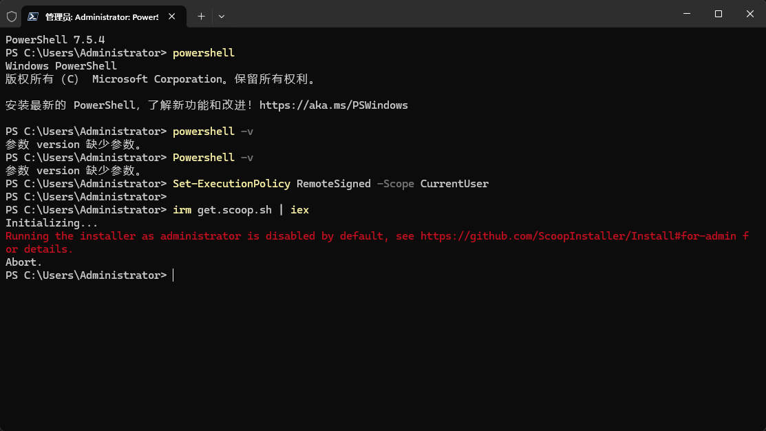 Scoop 为了安全(防止把软件装到系统核心目录去),默认是禁止这种行为的。但既然你就是管理员,我们需要用一种**“强行安装”**的方法来解决。