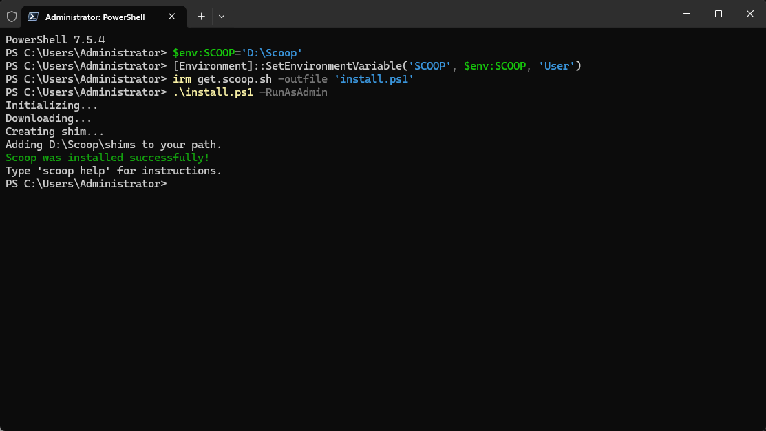 你会看到几行文字滚动。如果最后看到 "Scoop was installed successfully!",恭喜你,管家到位了!