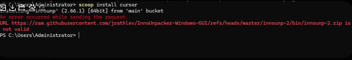 Scoop 在安装软件(或者像这里的 innounp 这种依赖工具)时,需要从 GitHub (raw.githubusercontent.com) 下载配置文件或资源。在国内,这个域名经常无法访问或连接被重置,导致报出 "URL is not valid" 或 "An error occurred while sending the request" 的错误。