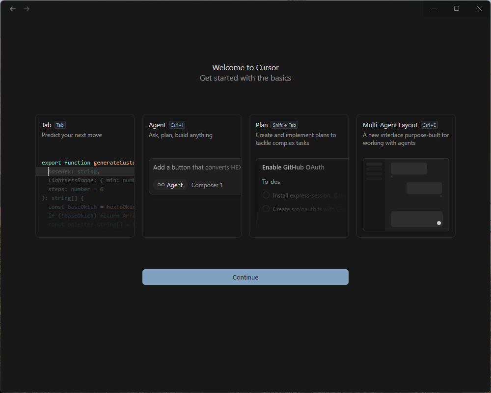 这是 Cursor 第一次启动时的 “初始化配置向导”。它在问你三个最核心的设置。