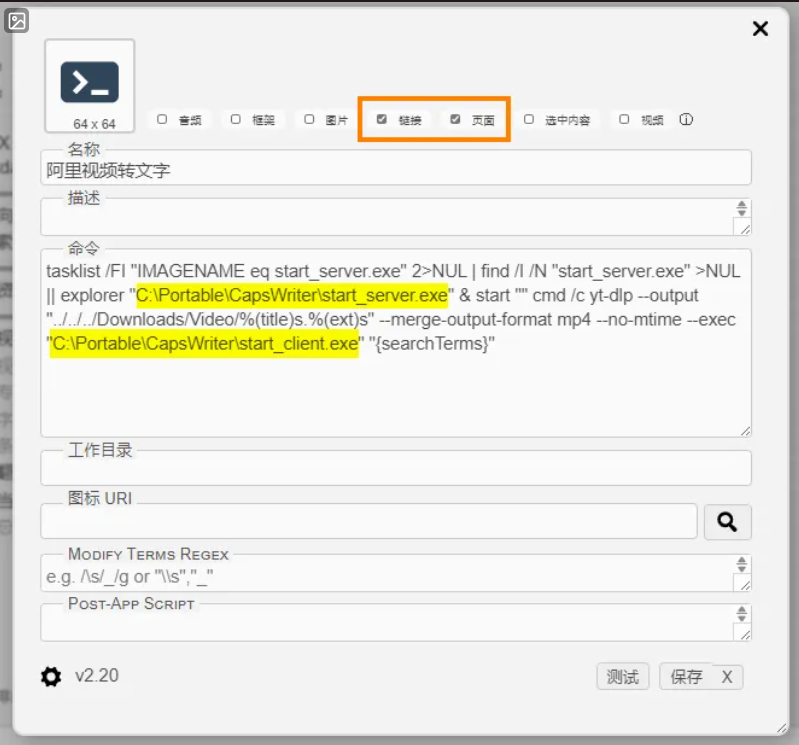 tasklist /FI "IMAGENAME eq start_server.exe" 2>NUL | find /I /N "start_server.exe" >NUL || explorer "D:\Video-Transcribe\CapsWriter-Offline-Windows-64bit\start_server.exe" & start "" cmd /k yt-dlp --output "D:\视频下载\%(title)s.%(ext)s" --merge-output-format mp4 --no-mtime --exec "D:\Video-Transcribe\CapsWriter-Offline-Windows-64bit\start_client.exe" "{searchTerms}"