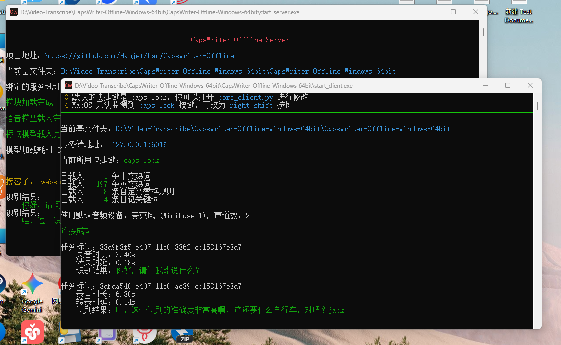 start_server.exe(CapsWriter 的服务端)在跑。如果没跑,就去