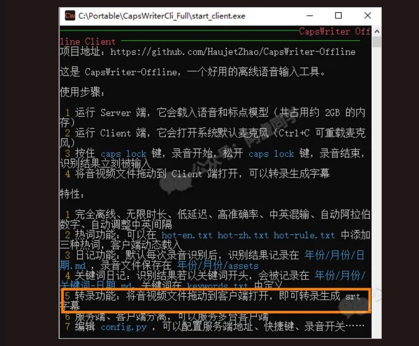 D:\Video-Transcribe\CapsWriter-Offline-Windows-64bit\start_client.exe作用:确保下载完视频后,能正确把文件传给客户端进行转录。